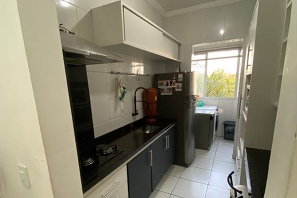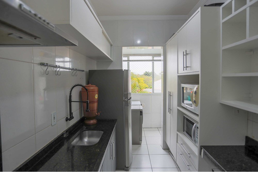 São ao todo 6 cômodos bem distribuídos, incluindo sala 2 ambientes, com rack modulado e ar condicionado, cozinha ampla com modulados e lavanderia com prateleiras. Linda porta de correr, madeira tipo celeiro, separa o acesso aos dois quartos, muito confortáveis, com planejados até o teto, sendo um deles com ar condicionado, além de amplo banheiro social.