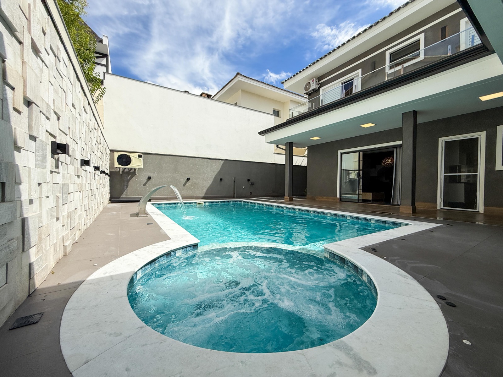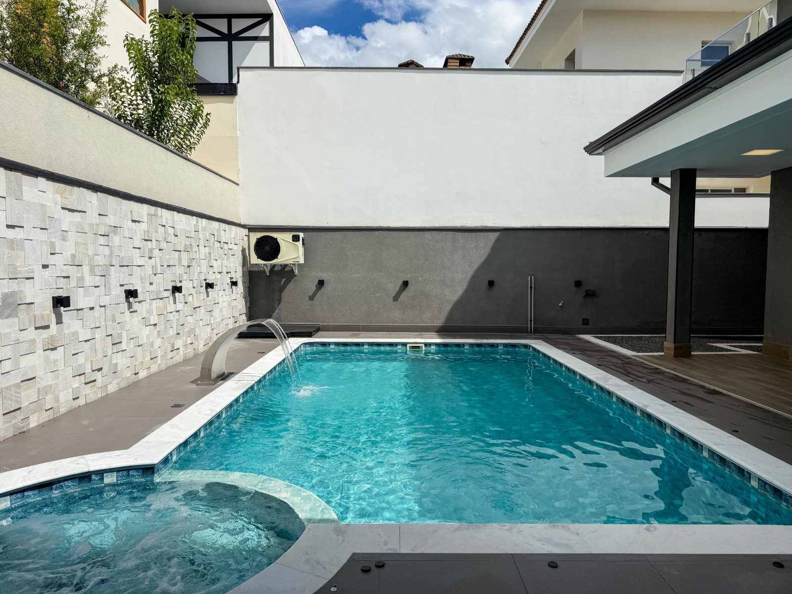 O lazer é um grande diferencial: área gourmet completa com churrasqueira, espaço para fogão de indução, balcão, pia e banheiro completo. A piscina possui aquecimento solar e elétrico, iluminação em LED, cascata e jacuzzi perfeita para momentos de relaxamento e convivência.