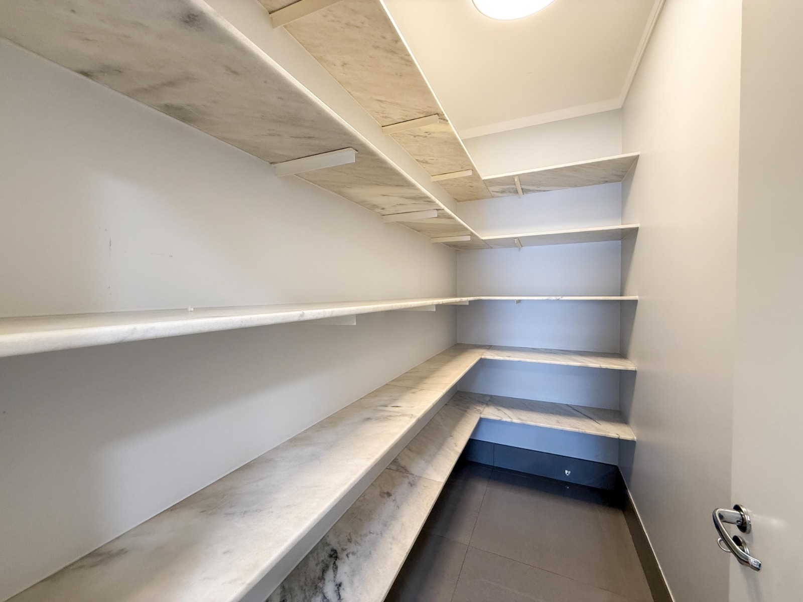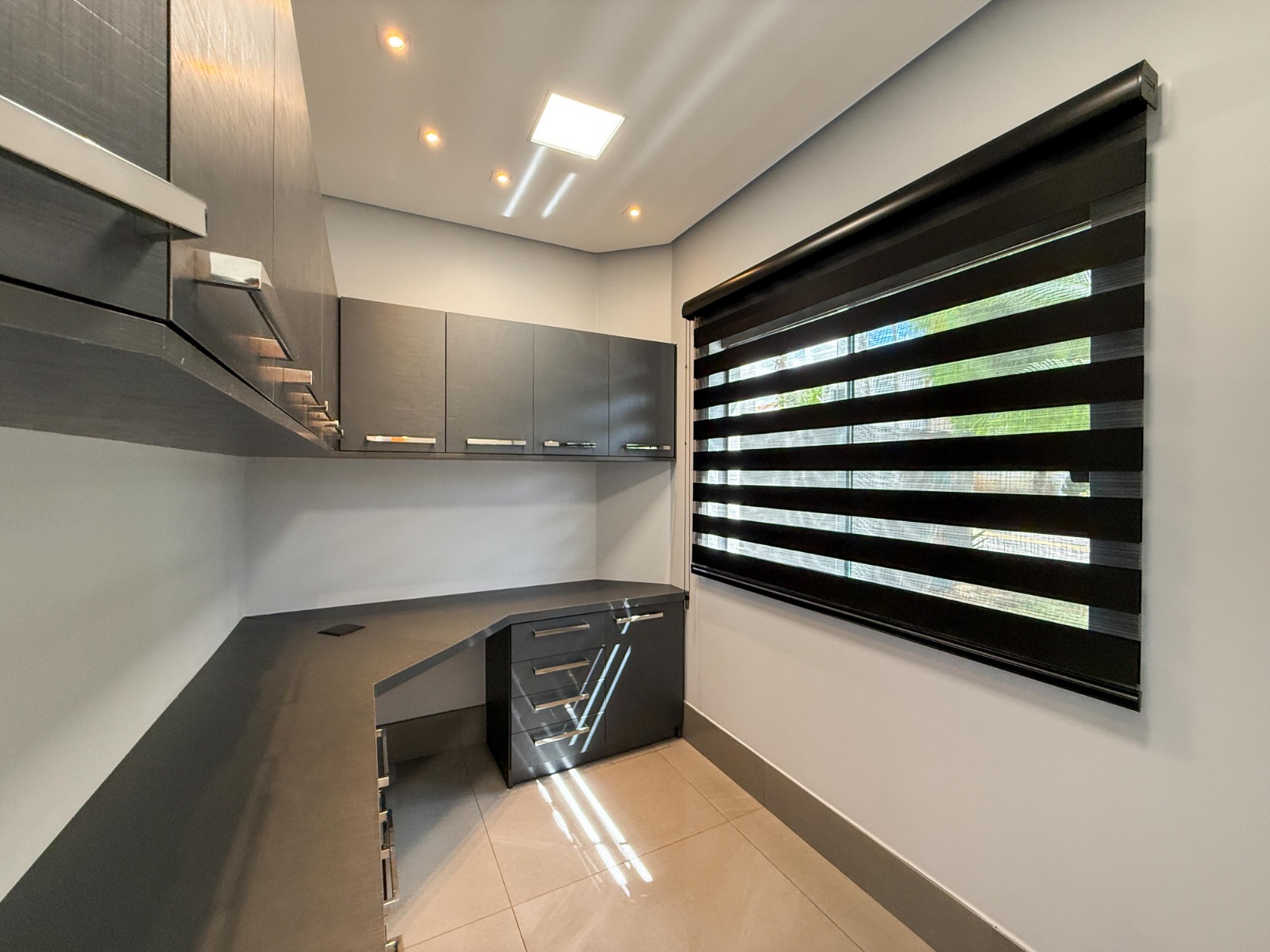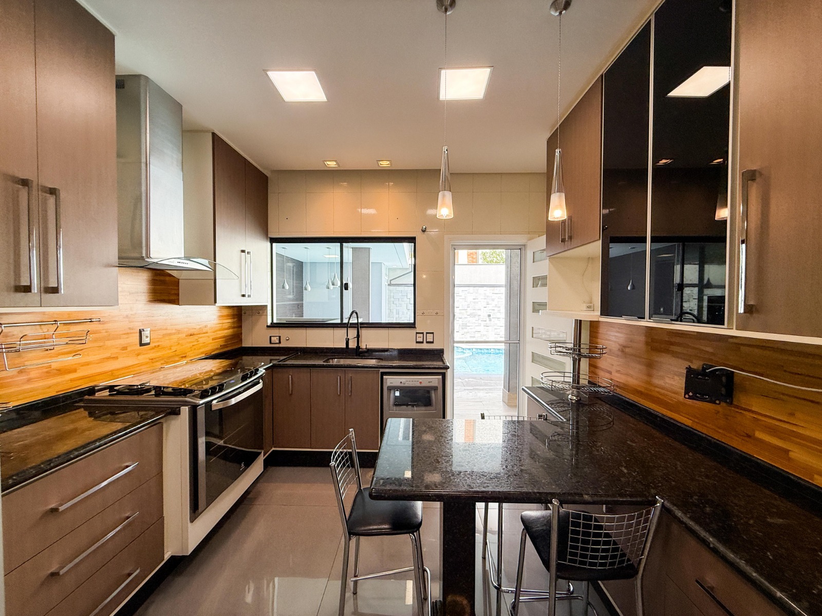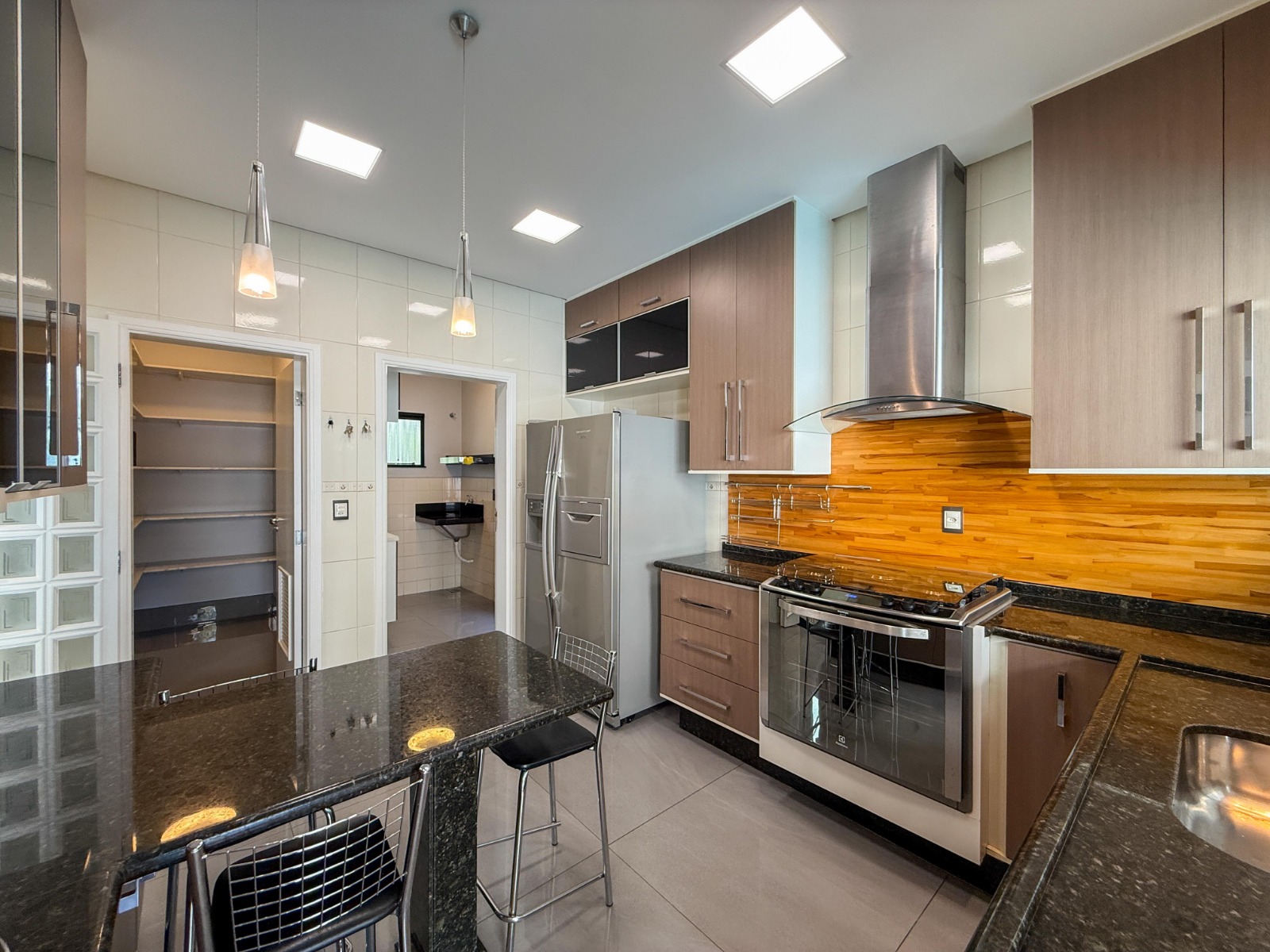 Dispõe ainda de escritório planejado, lavabo com armários, cozinha completa com armários modulados, fogão a gás Electrolux de 5 bocas, depurador de ar, geladeira Brastemp side by side, bancada e mesa em granito, máquina de lavar louças e despensa. A área de serviço é funcional, equipada com armários e prateleiras.